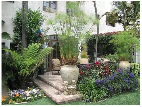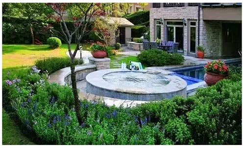 別墅庭院入口及坐臥停留的休息處對(duì)面,會(huì)形成視覺(jué)焦點(diǎn),需設(shè)置景觀小品來(lái)點(diǎn)綴。不管是雕塑、盆栽還是水景,都要美觀,引人注目,并與別墅庭院風(fēng)格整體一致。