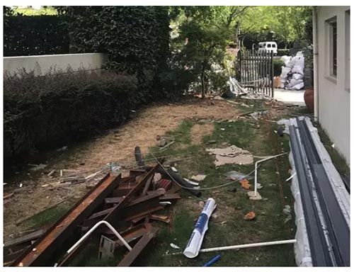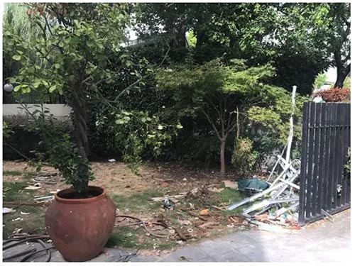 改造前的入口處,大盆栽也缺乏美觀,地面的垃圾已經(jīng)很難清理。原有的房屋建筑,把花園分成了狹小細長的兩段。面對這些的問題,設計師另辟蹊徑,將所有問題巧妙化解。