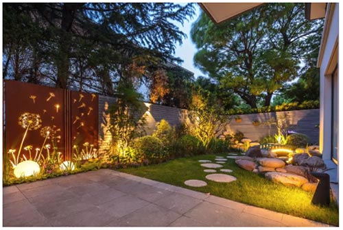 一進門一眼就能看到的就是耐候鋼板采用了蒲公英的圖案,充滿了浪漫,它搭配圓形燈為花園的入戶空間增添了溫馨的氛圍。
