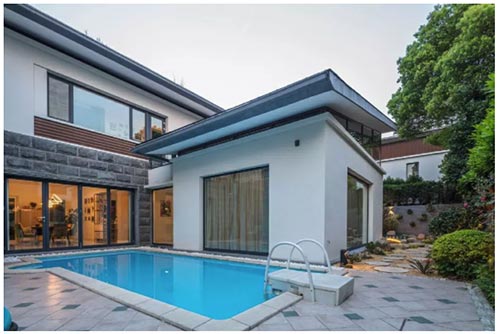 落地窗邊的水池是緊貼著墻面的,這次水池設計是一大亮點。白色建筑搭配藍色泳池,清爽大氣。與之搭配天藍色爬藤架,提升了整個空間的格調(diào)。