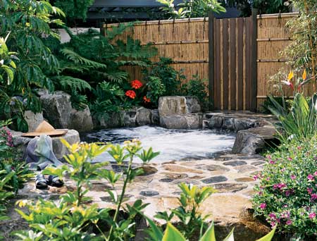 日式庭院的設(shè)計一定離不開水,根據(jù)個人喜好和庭院面積的不同,可以是一處帶有木制拱橋的池塘,可以是角落中一個洗手缽,或是象征大海和島嶼的沙池和巖石。水不但能為庭院增添景觀魅力,還充滿了東方式的哲學(xué)和禪思。