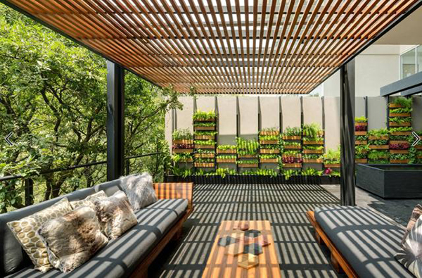 今天為大家?guī)?lái)的別墅花園案例是一個(gè)坐落在山頂上的別墅花園,做在花園里可以俯瞰山下的美景,坐擁日出日落的美好時(shí)光,整個(gè)小花園被綠樹(shù)環(huán)抱,植物的綠色與防腐木的木色搭配,色彩和諧鮮麗,再用黑色做了中間的色彩調(diào)和,成為了完美的色彩組合,花園中還有一個(gè)比較特別的笛梵,墻面上設(shè)計(jì)了花盆,整個(gè)墻面看上去就是一面植物墻,種植了許多花草,一眼望去美麗至極。