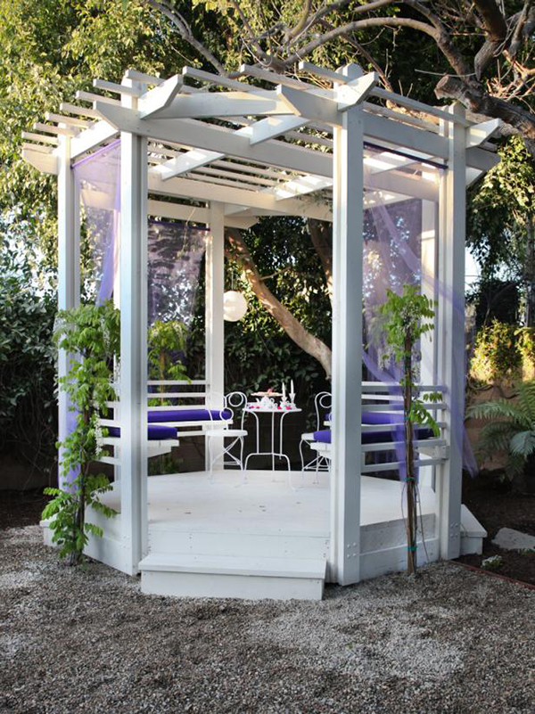 8、別墅花園中的涼亭不一定非得是傳統(tǒng)的樣式。你可以定制一個和自家別墅花園設(shè)計風(fēng)格相搭配的涼亭,擺上一些戶外家具,作為一個喝下午茶的地方是再合適不過了。如果你當(dāng)心下雨的話,可以像室外花架那樣在頂上加蓋一層夾膠玻璃。另外地面鋪裝,你可以采用礫石,而非地磚或石材,這也是我們常推薦的一種做法。