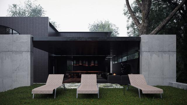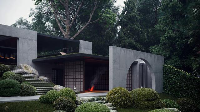 內(nèi)部和外部空間之間的線由細(xì)長的混凝土大門和一個(gè)巨大的混凝土拱門繪制,其形狀與格子狀特征窗口的形狀相呼應(yīng)。林間灌木也從景觀中突出來,沿著階梯狀的小路的邊緣拔地而起,從房子蜿蜒而下,來到花園底部的一個(gè)安靜的池塘。