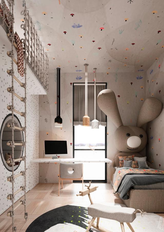 和天花板上。三個(gè)獨(dú)特的淺色吊燈照亮孩子的書房。