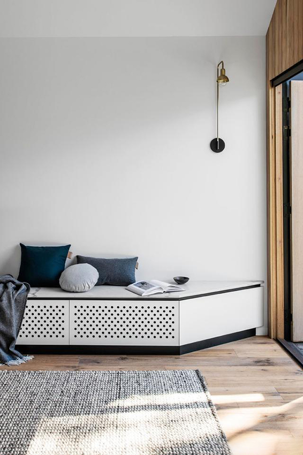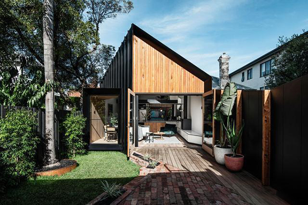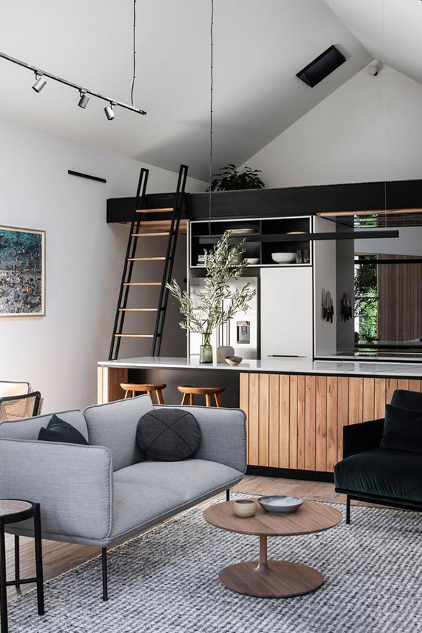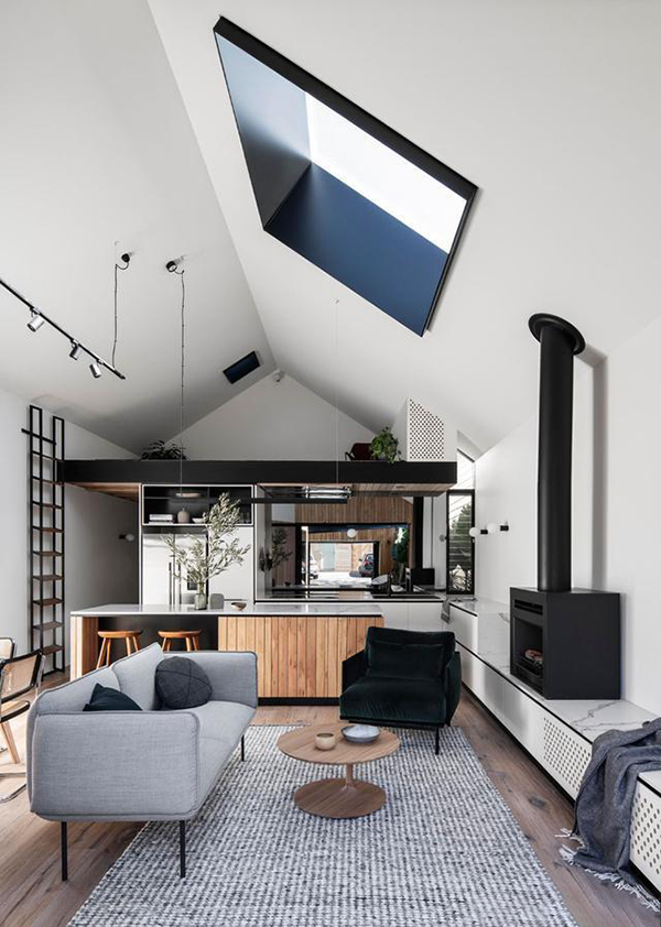 澳大利亞建筑工作室FIGR,為墨爾本的一所房屋設(shè)計(jì)了現(xiàn)代化小戶型,該房子使用面積僅有35平米左右。原來的房子設(shè)計(jì)空間相對比較的有限,這次的裝修設(shè)計(jì)增加了斜屋頂,和屋頂?shù)男¢w樓設(shè)計(jì),并采用了立縫黑色金屬壁板,Silvertop Ash搭疊壁板和擋風(fēng)板的組合設(shè)計(jì)。并利用結(jié)合了室內(nèi)外的空間再布局,充分把狹小的空間利用到極致。