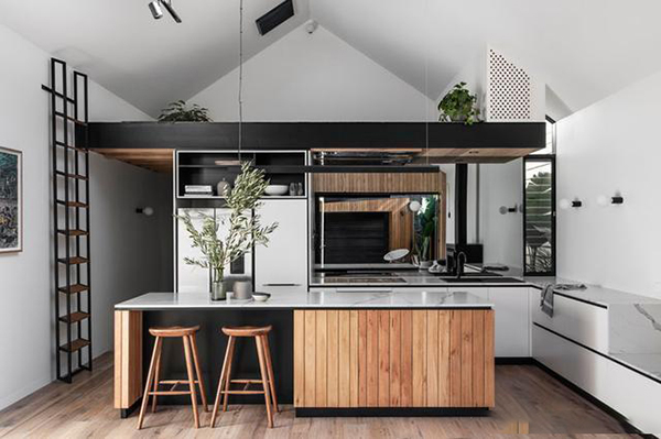在廚房里,一個帶黑色裝飾的大操作島與閣樓的黑色邊緣相得益彰,鏡面后擋板反映了后院的景色。開放式廚房的設(shè)計(jì)使得整個房子空間更加的通透寬敞一些。