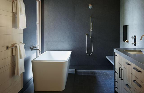 主浴室占據(jù)了主屋后部的石欄,但是可以從浴缸和淋浴間的窗戶看到戶外的水面。衛(wèi)生間使用的石灰?guī)r石深灰色搭配深色的方塊地板磚