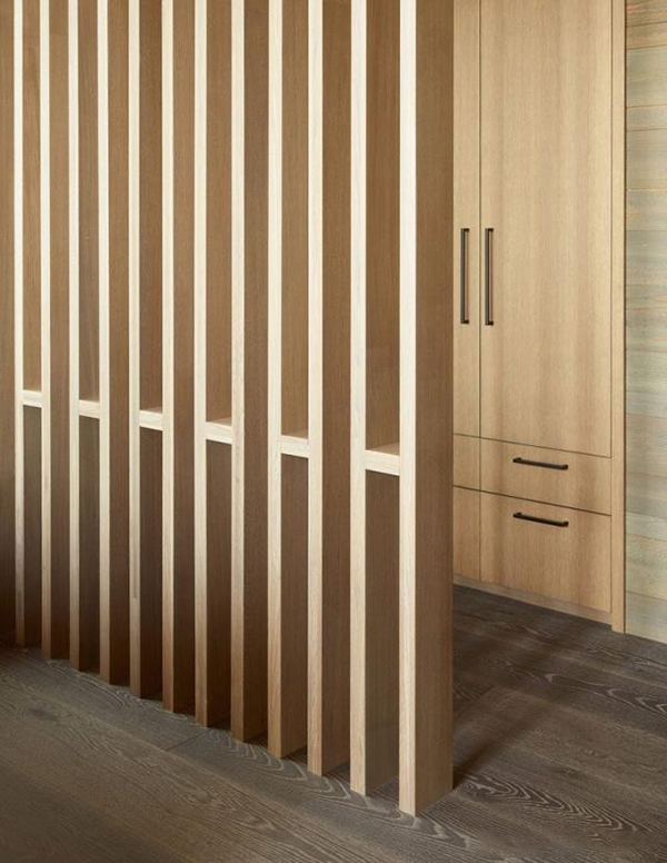 主臥室還設有簡約的現(xiàn)代化客房隔斷,將衣柜與睡眠區(qū)隔開。原木式的柵欄設計于整個臥室的裝修主色調(diào)保持在同一個色系上,使得整個空間更加的統(tǒng)一美觀。