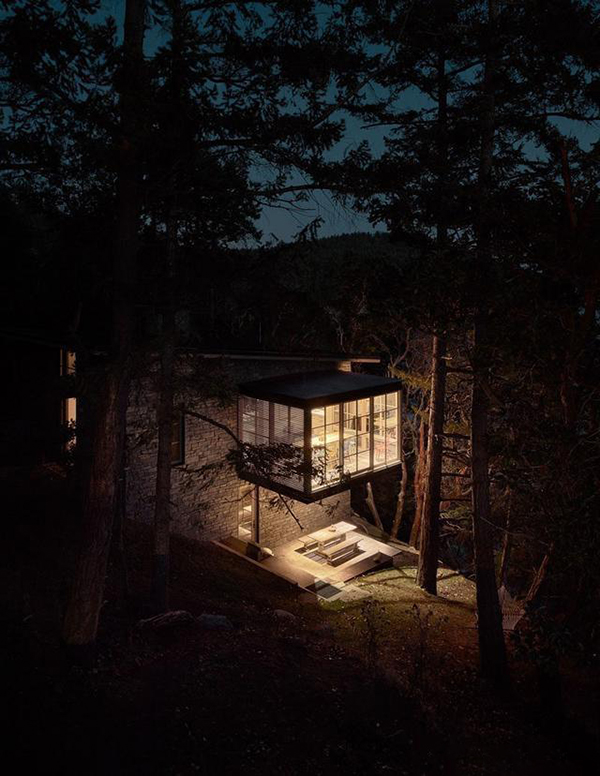 旅館小屋設有一個餐廳,設計為漂浮在樹林中的三面玻璃物體。在餐廳下方,有一個露天用餐區(qū),從上面懸臂式餐廳的燈光照亮。