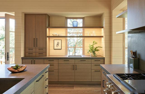 小屋的廚房擁有簡約而自然的淺色木質(zhì)和灰色臺面混合使用。廚房的設計為環(huán)繞型態(tài),三角區(qū)域互不干擾確保每個功能系統(tǒng)的正常使用。