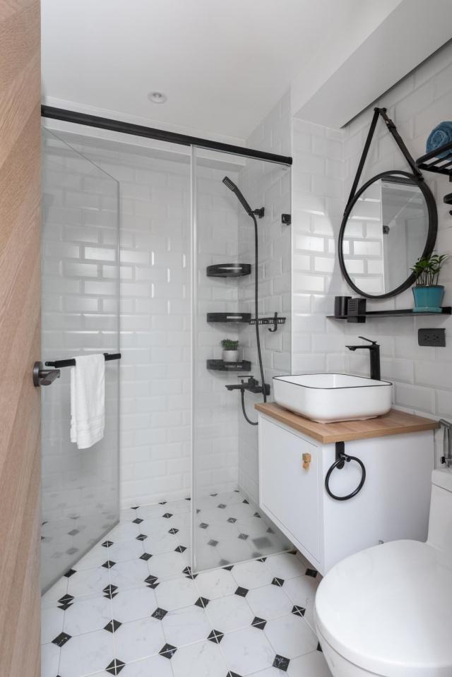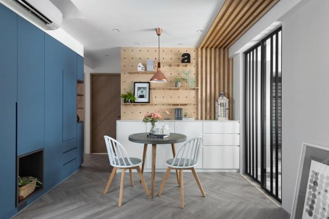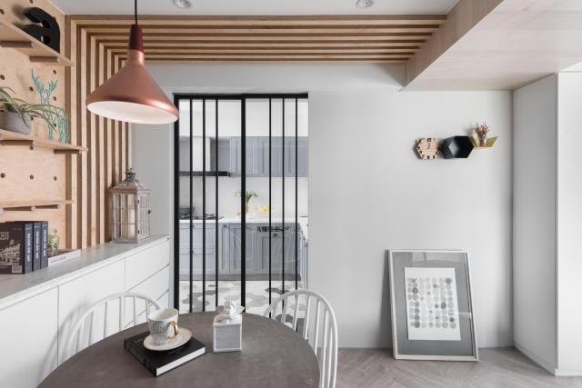 餐廳的設(shè)計(jì)小巧精致,因?yàn)椴蛷d空間有限,所以用了小圓桌,這樣非常節(jié)省空間,而且又實(shí)用,餐廳里還設(shè)計(jì)了餐邊柜,白色的地柜搭配原木色裝飾架,讓這個(gè)小空間清新又漂亮。餐廳的右側(cè)就是廚房,采用了黑色邊框的玻璃推拉門,與白色墻壁搭配簡(jiǎn)單又漂亮。