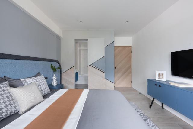主臥空間的設(shè)計(jì)最讓人喜歡,不僅設(shè)計(jì)效果漂亮,而且功能空間也很豐富,其中最有創(chuàng)意的就是隱形門的設(shè)計(jì),臥室中有兩個(gè)隱形門,一個(gè)是衛(wèi)生間門,另一個(gè)是衣帽間門。衛(wèi)生間門被隱藏在墻壁的圖案中,門在閉合的狀態(tài)下,就是一幅裝飾圖案,而推開門就是衛(wèi)生間,效果非常漂亮。衣帽間門被隱藏在床頭背景墻中,正常狀態(tài)下就是一面床頭墻,推開門后里面就是衣帽間,衣帽間中的收納空間也很豐富。這樣的設(shè)計(jì)使臥室的效果完整又漂亮,有很強(qiáng)的空間連續(xù)感,將實(shí)用和形式完美的結(jié)合。