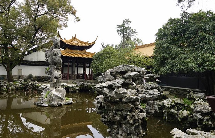 可以使庭院空間增加層次,曲折幽深,在有限空間內(nèi)創(chuàng)造無(wú)線(xiàn)的空間感。用假山分隔空間,增加空間層次和起伏變化的藝術(shù)效果。如無(wú)錫寄暢園主庭院中部橫疊大山,假山高低起伏,延至西北部又復(fù)高起,似與惠山聯(lián)成一片,增加了山水及空間的層次感。
