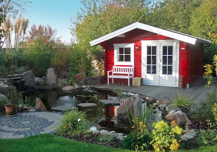 5. 紅白相襯的小屋前,有座很有禪意的水池,飾以大大小小的石塊和各種花草植栽,令人感到心曠又神怡