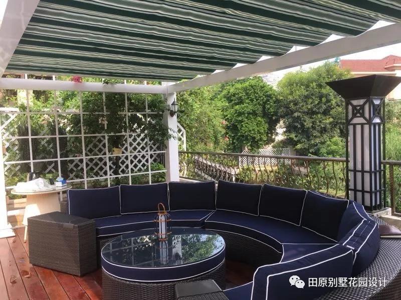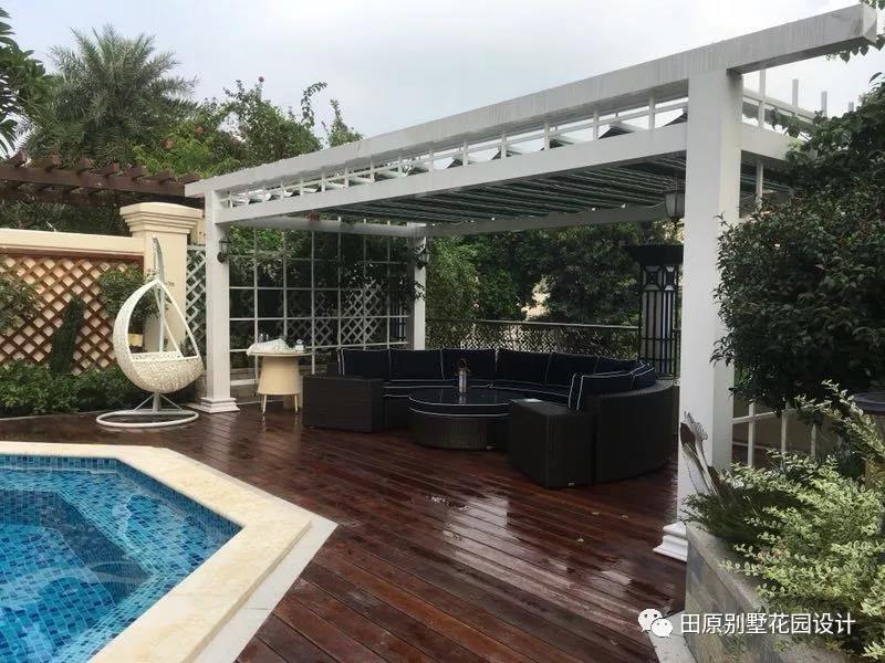 別墅花園泳池旁依建筑風(fēng)格而建的方形花架,內(nèi)設(shè)舒適沙發(fā)與茶幾將客廳移至室外,接待賓客于山水之間,感受自然回饋的自由與舒適,如身處水上天堂般令人身心放松與愉悅。設(shè)計(jì)師合理運(yùn)用周?chē)挛镒屢磺薪ㄖ疾伙@得突兀,紅色的實(shí)木地板,配以頂棚別致的黑白線條,景致的遙相呼應(yīng)讓泳池不再孤立,整個(gè)休閑平臺(tái)顯得優(yōu)雅大方。遮陽(yáng)棚下,飲酒品茗、享受美食、休憩娛樂(lè),設(shè)計(jì)師通過(guò)借景到自家后花園,將此處無(wú)限擴(kuò)大,彰顯出擁有者的巨大實(shí)力。