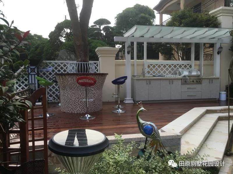 臺(tái)階旁邊,屹立著一只美麗的藍(lán)孔雀,樹(shù)下,院子臺(tái)階的轉(zhuǎn)角處是一個(gè)簡(jiǎn)潔而干凈的燒烤平臺(tái),放置休閑座椅,旁邊的盆栽正縱情綻放,背后是郁郁蔥蔥的大樹(shù),綠色又環(huán)保,表現(xiàn)出園主視己與自然渾同一體。以觀遠(yuǎn)山近水,舒展胸懷,各有其妙,別墅花園每個(gè)空間都好好利用,既要有漂亮的景致,也要有實(shí)用價(jià)值。