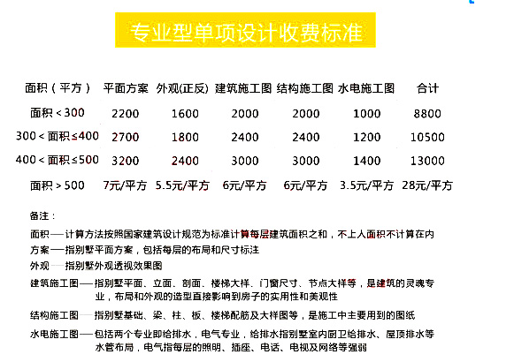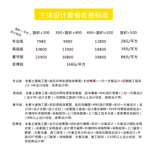 主體設(shè)計是一棟房子的重中之重,所以我們分 了專業(yè)版、高端版、豪華版和至尊版,面積不同價格不同,以下是詳細價格:
