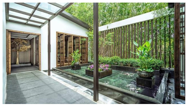 1.新中式庭院:新中式庭院脫離了繁復(fù)的古典形式,融入當(dāng)代風(fēng)格,以隱喻的手法打造元素空間,呈現(xiàn)出各小景幽靜、舒適的生活空間,營造出自然質(zhì)樸、溫馨閑適的生活基調(diào)。