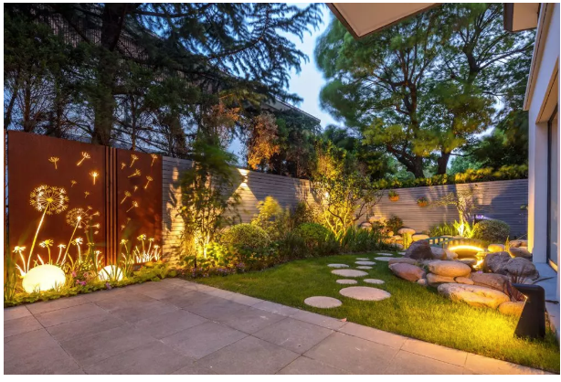 一進(jìn)門一眼就能看到的就是耐候鋼板采用了蒲公英的圖案,充滿了浪漫,它搭配圓形燈為花園的入戶空間增添了溫馨的氛圍。