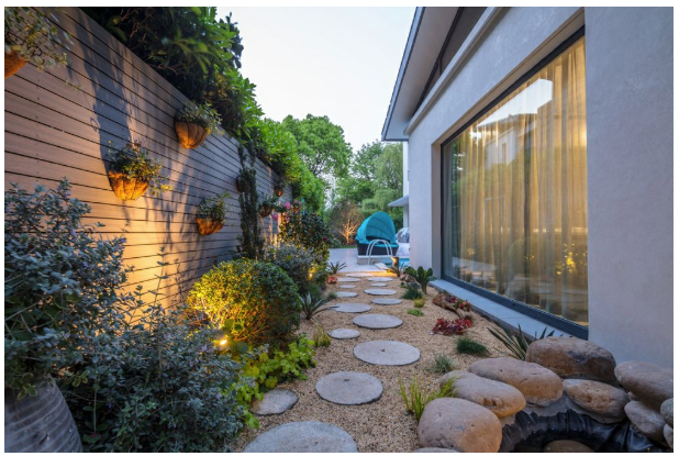 往前走,就看到黃銹石汀步搭配青青草坪,在鏡頭下顯得異??蓯?。石頭堆砌出的假山水景支上的藍(lán)色小橋,個(gè)性又增添顏值。