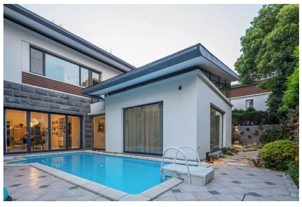 落地窗邊的水池是緊貼著墻面的,這次水池設(shè)計(jì)是一大亮點(diǎn)。白色建筑搭配藍(lán)色泳池,清爽大氣。與之搭配天藍(lán)色爬藤架,提升了整個(gè)空間的格調(diào)。