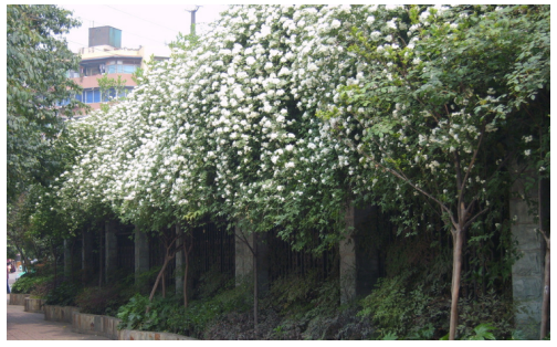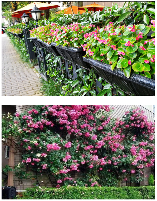 花籬:由開花灌木組成,一般任其生長,不修剪成規(guī)則式。是園林綠地中比較精美的綠籬形式,常用于重點(diǎn)綠化地帶。如扶桑、木槿、梔子、迎春、繡線菊、月季、桂花、茉莉、六月雪等,和常綠芳香花木用在芳香園中作為花籬,尤具特色?;ɑh不但花色、花期不同,而且還有花的大小、形狀、有無香氣等的差異而形成情調(diào)各異的景色。
