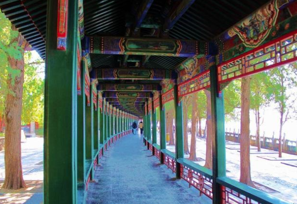 2、湖山結(jié)合。湖北岸的萬壽山高 58米,好像翠屏峙立。湖光山色,相映成趣。前山是全園的中心,正中為一組巨大的建筑群,自山頂?shù)闹腔酆6率欠鹣汩w、檀輝殿、排云殿、排云門、云輝玉宇坊以達(dá)湖面。其中,琉璃磚瓦的無梁殿(智慧海)和高41米的佛香閣,氣勢(shì)雄偉,為最具特色的建筑。這組中軸線的兩旁,布置了許多陪襯的建筑物。抱山環(huán)湖一帶建有長(zhǎng)廓和石欄,把湖與山明顯地區(qū)分又緊密地連接在一起。